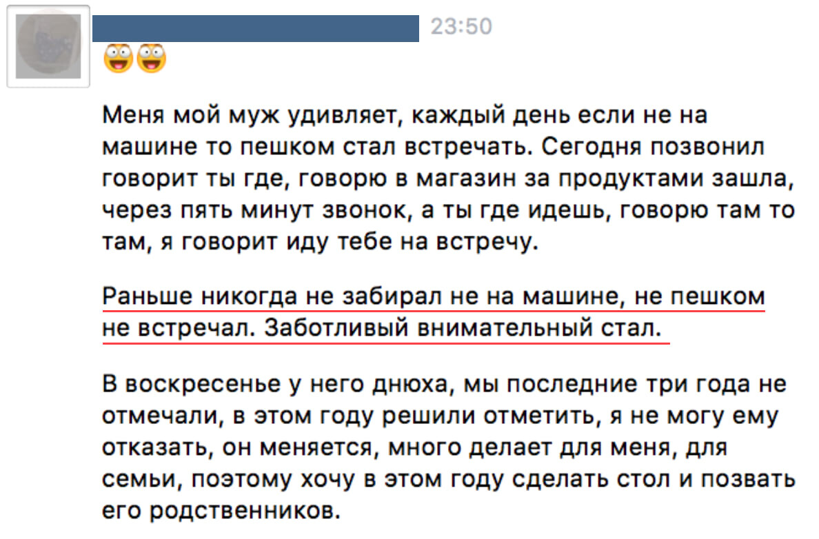 Например, если сейчас супруг не стремится вам звонить и писать в течение дня, то "Корректировка поведения" может изменить эту ситуацию.