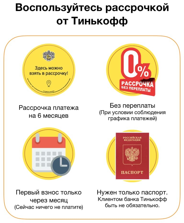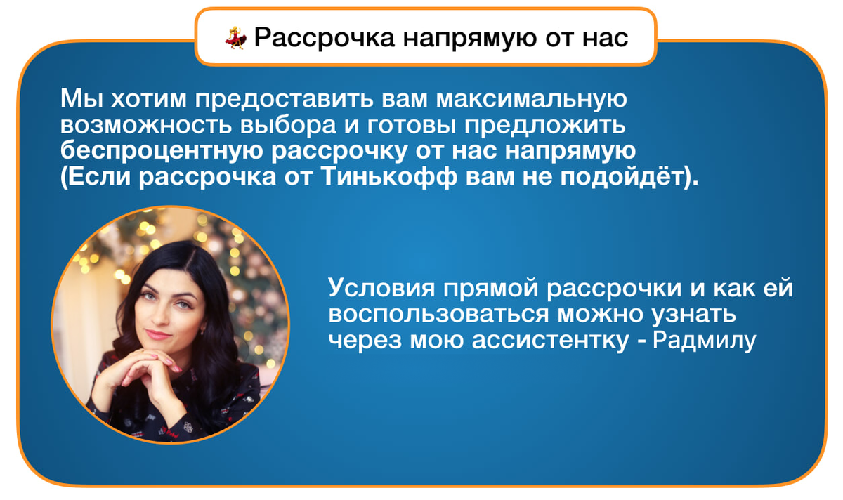 Для приобретения в рассрочку просто оформите заявку на интересующий вас пакет участия и на странице при выборе метода оплаты нажмите «Оформить в рассрочку».